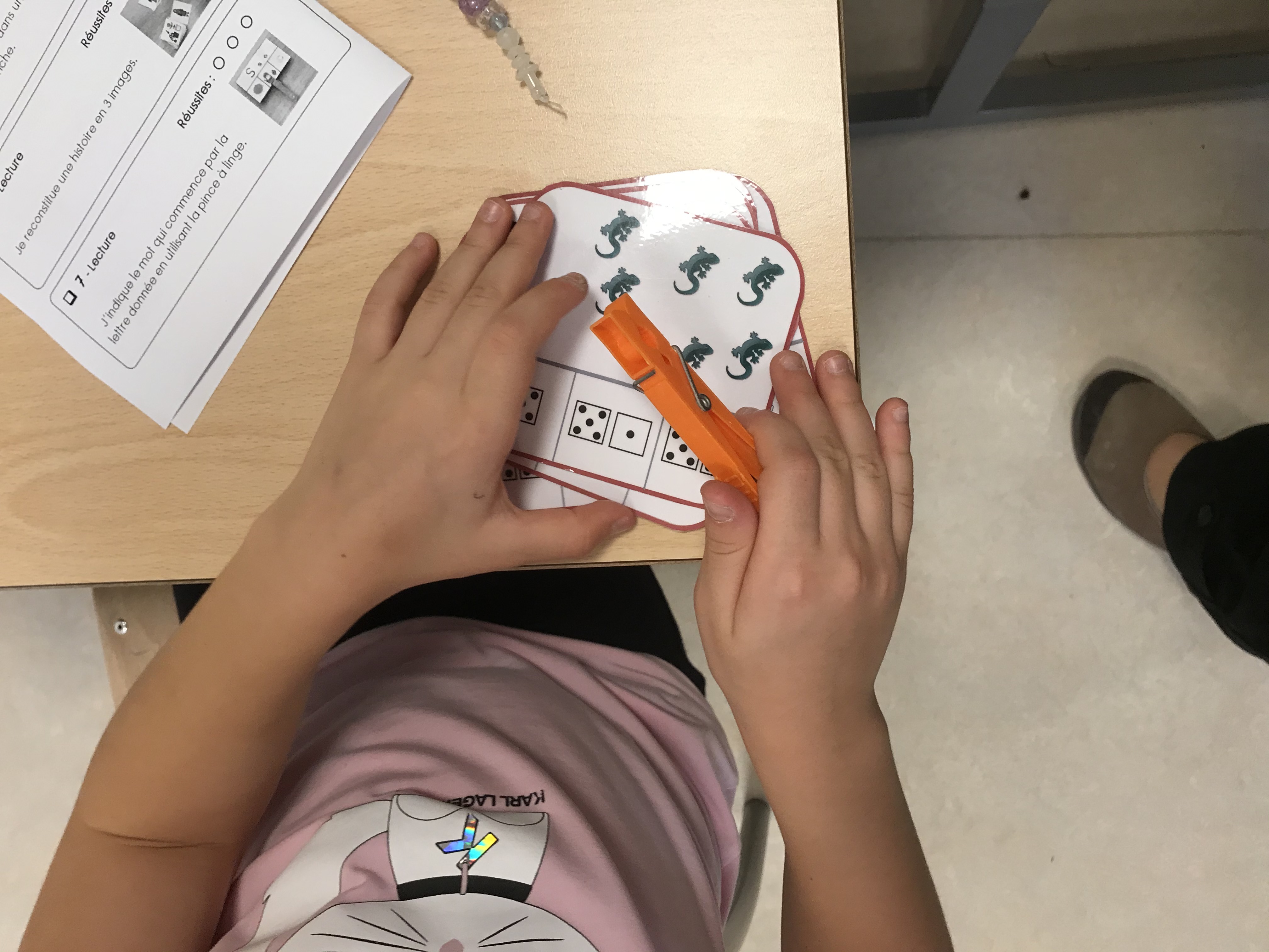 Chaque jour, nous travaillons avec le jeu d'un tiroir jaune. C'est un jeu de maths ou de français qui nous permet de réviser. On a une feuille qui nous permet :
