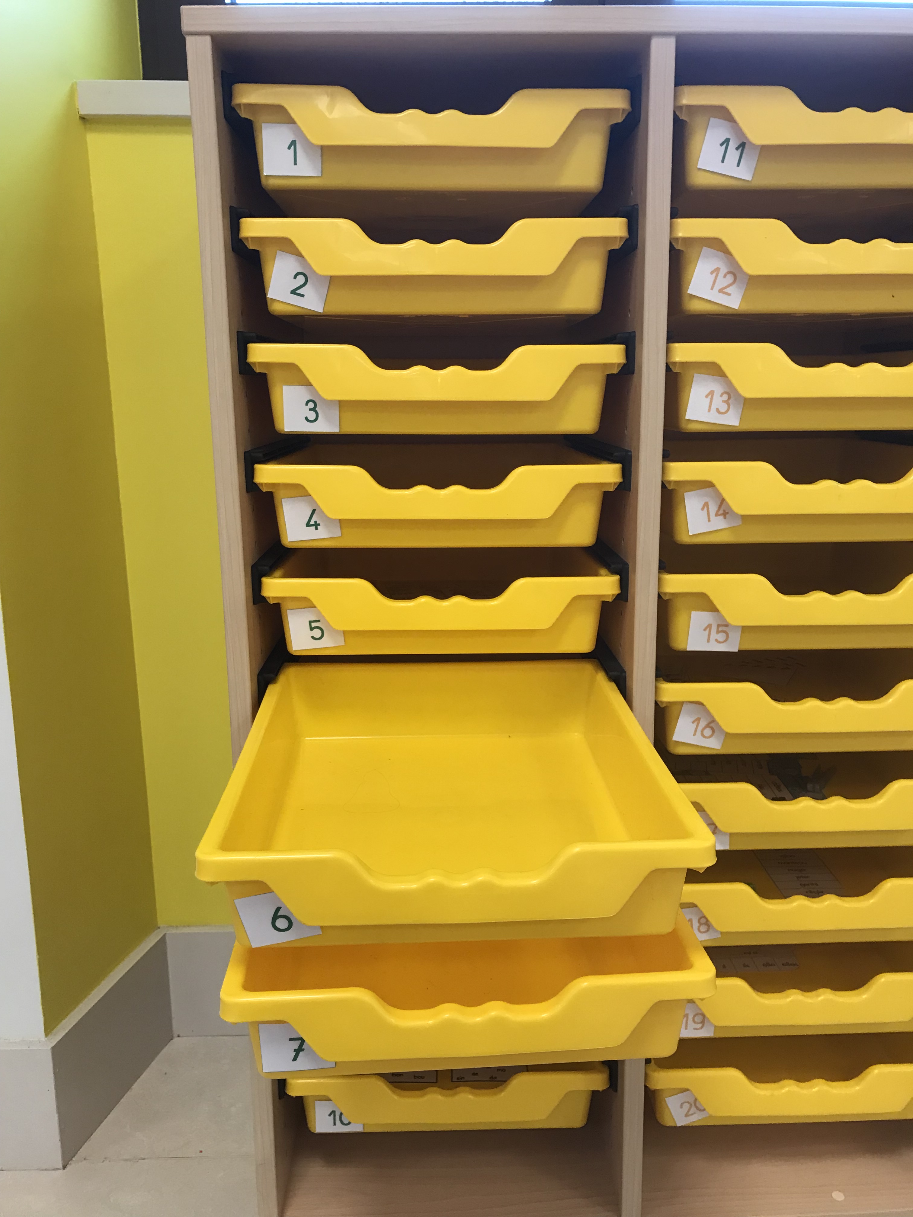 On met des mots dans une boîte. Un camarade nous dicte un mot-outil de la boîte. Le camarade vérifie si le mot est correct. Quand on réussit plusieurs fois le même mot, on peut le mettre dans un autre tiroir. Quand un mot est dans le tiroir vert, c'est qu'on le connait très bien.